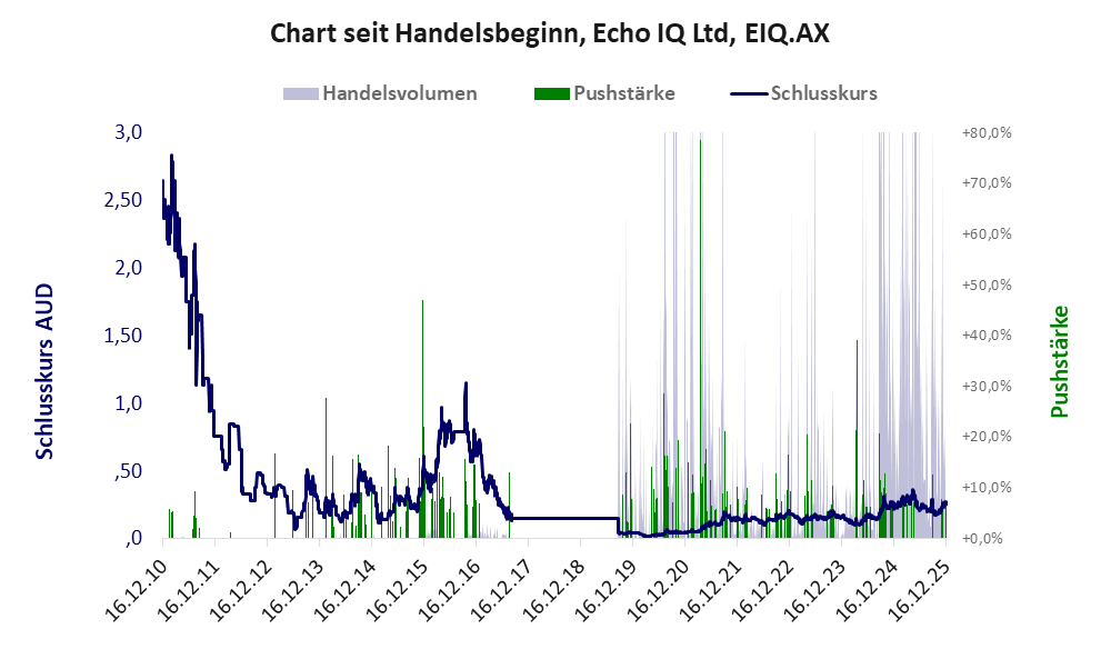 Wieder eine minderwertige Aktie, die mühelos an der FWB einbezogen wurde. Die massenweise vorhandenen Kurspushes sind unspektakulär, aber die Simulation der Handelsergebnisse ergibt in Summe dennoch gut 4 Mio. AUD Gewinn. Bei dieser Aktie liegt das „Inkassomodell“ vor, bei dem der Aktienkurs zu Beginn der Geschichte sein Allzeithoch hat. Die Akteure verkaufen schon zu Beginn nach und nach ihre billigst erworbenen Aktien, so dass der Kurs in verhältnismäßig kurzer Zeit abstürzt. Danach dümpelt der Aktienkurs in den meistn Fällen nahe null dahin und die Aktie dient nur noch kleineren, dennoch gewinnbringenden Pushmanövern und in vielen Fällen dem Algotrading. Dem ersten Einbruch nachfolgende größere Pushmanöver sind aber nicht ausgeschlossen.