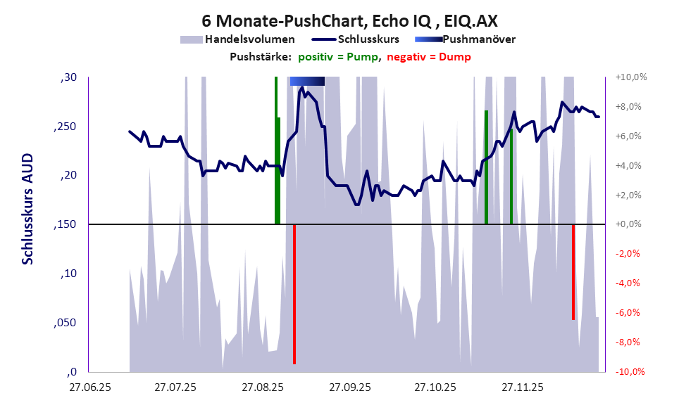 zeigt <abbr class='c2c-text-hover' title='bei einem Pushmanöver treiben Akteure und Medien den Aktienkurs manipulativ kurzfristig zum eigenen Vorteil nach oben.'>Pushmanöver</abbr> während der letzten sechs Monate