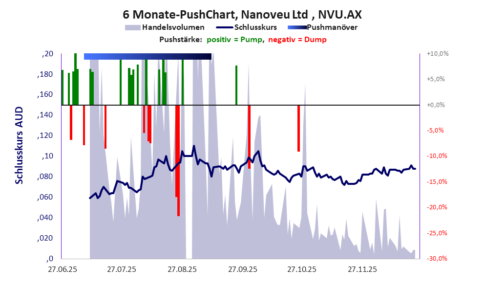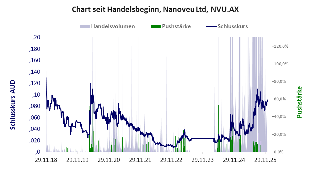 Die 2012 gegründete Firma hat – wie der Aktienkurs im untersten Pennybereich belegt – wenig zu Stande gebracht. Nanoveu startete im April 2024 und die Aktie dient dem Scoring zu Folge in erster Linie dem Kurspushing, das nach Schätzrechnung fünf Mio. AUD eingebracht haben könnte. Den Charakter der Aktie belegt zudem der Forumsbeitrag auf wallstreet-online durch einen Alleinunterhalter. Bei dieser Aktie liegt das „Inkassomodell“ vor, bei dem der Aktienkurs zu Beginn der Geschichte sein Allzeithoch hat. Die Akteure verkaufen schon zu Beginn nach und nach ihre billigst erworbenen Aktien, so dass der Kurs in verhältnismäßig kurzer Zeit abstürzt. Danach dümpelt der Aktienkurs in den meistn Fällen nahe null dahin und die Aktie dient nur noch kleineren, dennoch gewinnbringenden Pushmanövern und in vielen Fällen dem Algotrading. Dem ersten Einbruch nachfolgende größere Pushmanöver sind aber nicht ausgeschlossen. Bei dieser Aktie vollzogen die Akteure mindestens einen Pump & Dump und leerten damit ganz gezielt die Taschen der Anleger. Obwohl das Vorgehen rechtswidrig ist, erfolgt kaum je eine Strafverfolgung.