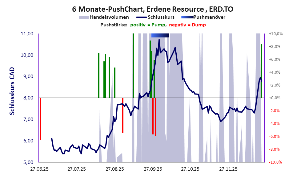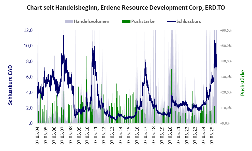 Erdene Resource hat einen verblüffend niedrigen PushScore, obwohl der Aktienkurs permanent gepusht wird. Operativ hat das Unternehmen seit über 20 Jahren keinen Erfolg, aber für Zocker ist der Aktienkurs allemal interessant. Der laufende Push, der seit Ende Januar 2025 in Gang ist, könnte schon bald beendet sein. Dieser Aktie liegt das „Refreshmodell“ zu Grunde. Eine Durchsicht aller Geschäftsberichte würde recht sicher zeigen, dass das Unternehmen nie Umsatz und Profit erzielte und die gesamten Explorationskosten unter „Aktiva“ verbuchte. Das heißt, während aller Jahre wurde nichts gefunden, sondern die Investorengelder wurden für erfolglose Explorationsarbeiten verbrannt. Die bescheidene Exploration dient lediglich als Grundlage zur medialen Vermarktung von Erfolgsaussichten, auf eine große Lagerstätte zu stoßen, um damit das nächste Pushmanöver zu befeuern.