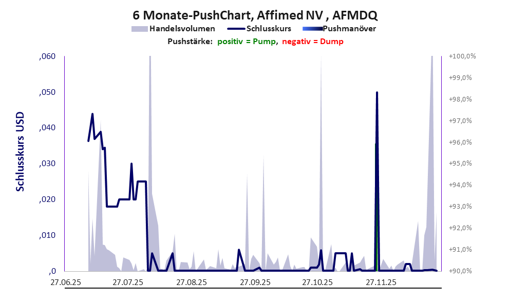Affimed scheiterte, weil die Projekte AFM13 (gegen Lymphome) und AFM24 (gegen nicht-kleinzelliges Lungenkarzinom) nicht wie geplant weiterentwickelt werden konnten. Affimed meldete allerdings positive Ergebnisse für das Produkt AFM24. Daran könnten Investoren Interesse haben. Darüber hinaus wird es als unwahrscheinlich angesehen, Käufer für Affimed zu finden. Bei dieser Aktie liegt das „Inkassomodell“ vor, bei dem der Aktienkurs zu Beginn der Geschichte sein Allzeithoch hat. Die Akteure verkaufen schon zu Beginn nach und nach ihre billigst erworbenen Aktien, so dass der Kurs in verhältnismäßig kurzer Zeit abstürzt. Danach dümpelt der Aktienkurs in den meistn Fällen nahe null dahin und die Aktie dient nur noch kleineren, dennoch gewinnbringenden Pushmanövern und in vielen Fällen dem Algotrading. Dem ersten Einbruch nachfolgende größere Pushmanöver sind aber nicht ausgeschlossen.
