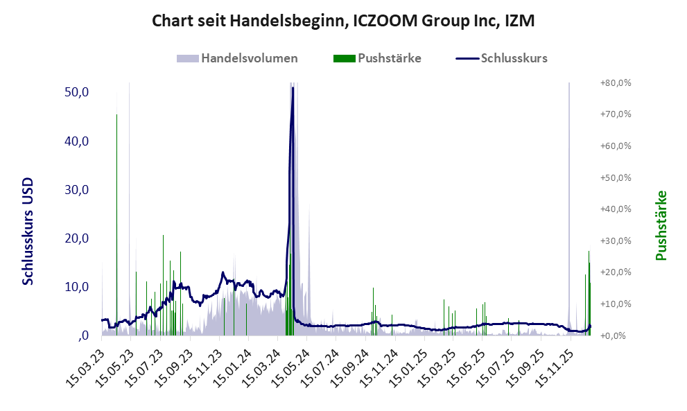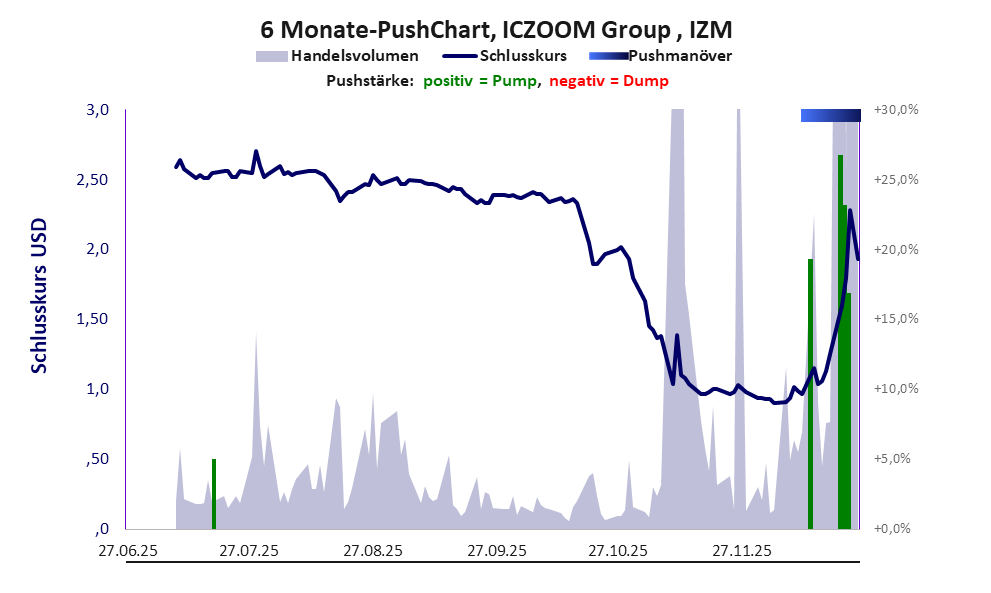 Iczoom zählt zu einer Gruppe chinesischer Firmen deren Aktien in den USA oder auf den Antillen beheimatet sind und die auf der Warnliste der BaFin stehen. Der Aktienkurs dieser Firmen zeigt schlagartig durchgeführte Dumps, mit denen die Anleger (oft in Chatgruppen organisiert) um ihr Geld betrogen wurden. Charakteristisch ist für die meisten dieser Firmen, dass ihr Scoring meist recht gut und einer der Gründe ist, Anleger erfolgreich hinter das Licht geführt zu haben. Die Pushstärke zeigt allerdings das Risiko auf. Iczoom könnte nach vorsichtiger Schätzung bei dem Dump mehr als eine halbe Milliarde USD abgeräumt haben. Die Geschichte, wie abgezockt wird, steht unter „Am Handy abgezockt„. Bei dieser Aktie vollzogen die Akteure mindestens einen Pump & Dump und leerten damit ganz gezielt die Taschen der Anleger. Obwohl das Vorgehen rechtswidrig ist, erfolgt kaum je eine Strafverfolgung.