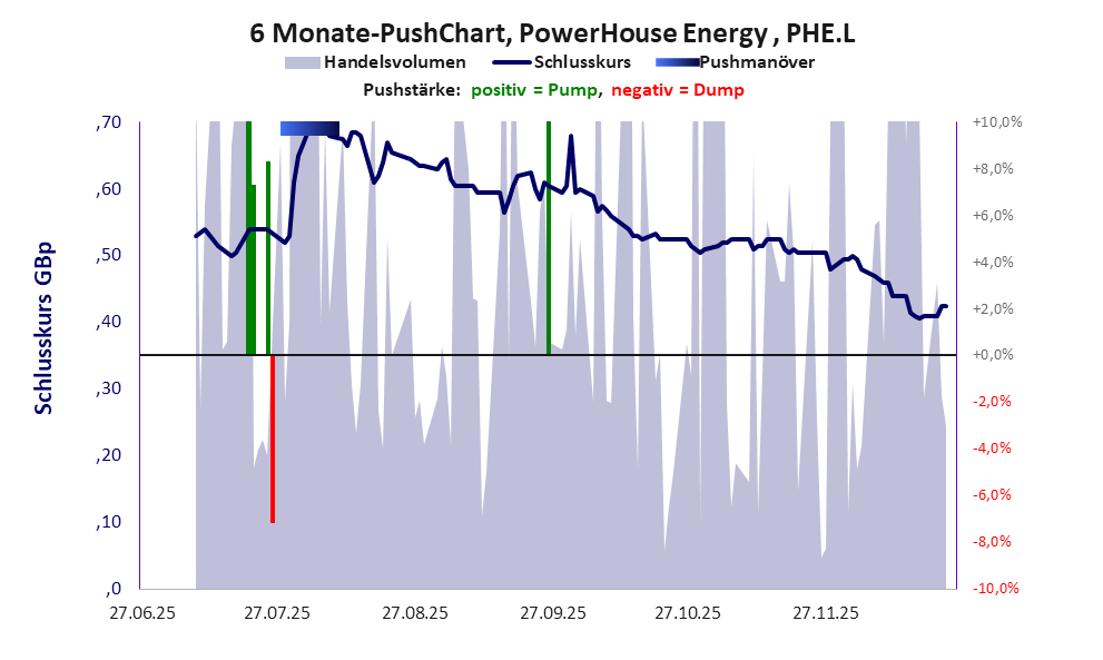 zeigt <abbr class='c2c-text-hover' title='bei einem Pushmanöver treiben Akteure und Medien den Aktienkurs manipulativ kurzfristig zum eigenen Vorteil nach oben.'>Pushmanöver</abbr> während der letzten sechs Monate