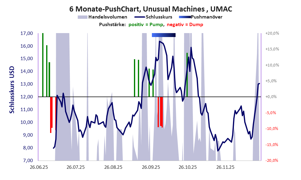 zeigt <abbr class='c2c-text-hover' title='bei einem Pushmanöver treiben Akteure und Medien den Aktienkurs manipulativ kurzfristig zum eigenen Vorteil nach oben.'>Pushmanöver</abbr> während der letzten sechs Monate