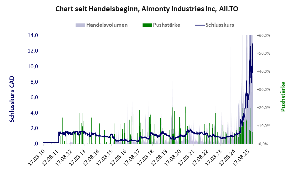 Die Aktie eines Bergbauunternehmens, die in 2025 einen gigantischen Kursanstieg verzeichnete und simplywall dem Unternehmen eine gute Zukunftsaussicht bescheinigt. Die Finanzdaten mahnen jedoch zur Vorsicht: Almonty verdient noch nichts und die Aktie wird von Apaton massiv gepusht. Der Kurs ist geprägt von teils starken Abverkäufen und der Kursanstieg in 2025 ist stark spekulativer Natur. Es darf weiter spekuliert werden. Entweder erreicht der Abbau tatsächlich wirtschaftlichen Erfolg oder es folgt der Kurseinbruch wie in so vielen anderen Fällen.