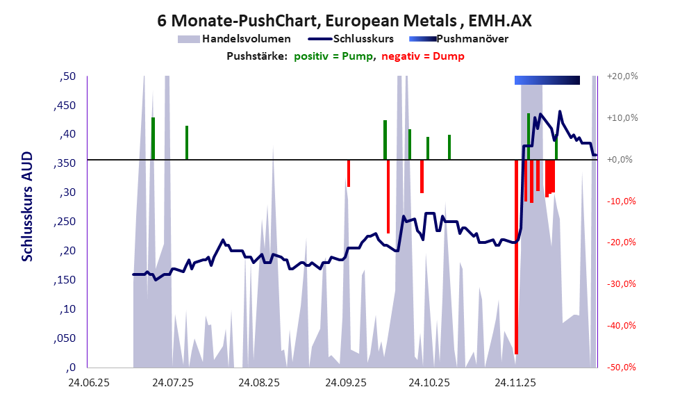 zeigt <abbr class='c2c-text-hover' title='bei einem Pushmanöver treiben Akteure und Medien den Aktienkurs manipulativ kurzfristig zum eigenen Vorteil nach oben.'>Pushmanöver</abbr> während der letzten sechs Monate