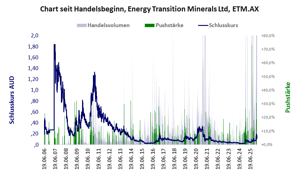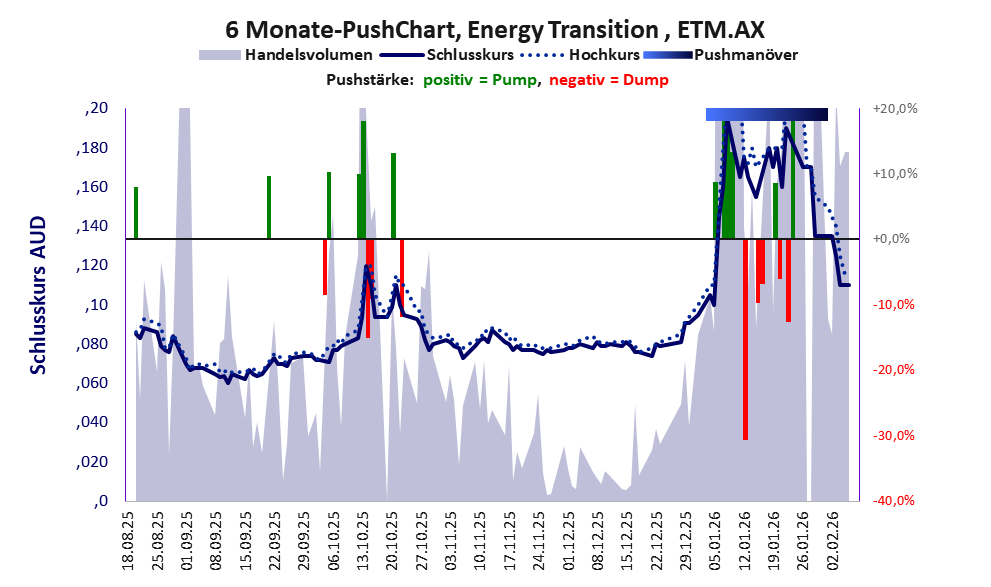 Bei dieser Aktie, über die w:o berichtet, liegt das Refreshmodell und das Inkassomodell vor. Das tägliche Handelsvolumen betrug an obiger Börse während der letzten drei Monate bis Berichtsdatum: 7.151.850 Stück, das sind 0,4% der ausgegebenen Aktien. Da Energy Transition kaum Vermögen besitzt und unprofitabel ist, hat der Aktienkurs keinen Wert. Die Aktie dient in erster Linie Pushmanövern.