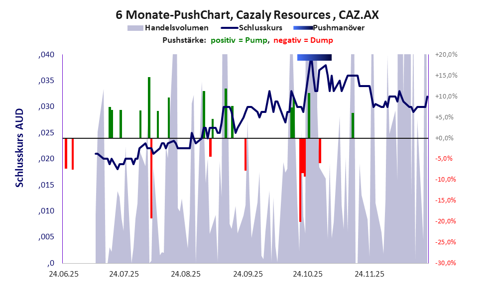 zeigt <abbr class='c2c-text-hover' title='bei einem Pushmanöver treiben Akteure und Medien den Aktienkurs manipulativ kurzfristig zum eigenen Vorteil nach oben.'>Pushmanöver</abbr> während der letzten sechs Monate