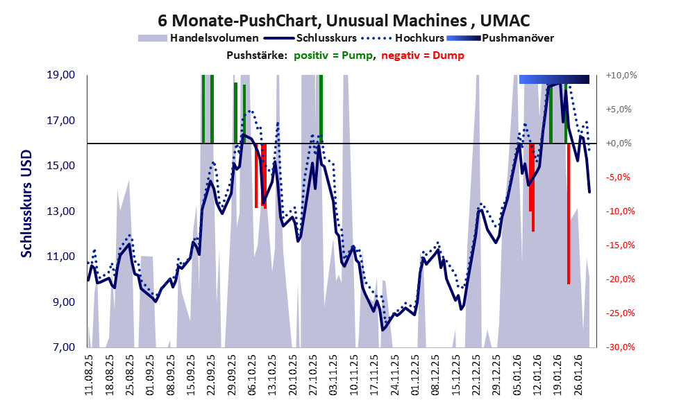 Ein kleiner Mittelständler, der mit seinem Drohnen-Geschäft im Aufwind zu sein scheint. Gepusht wurde der Kurs wohl in erster Linie durch den Einstieg von Trump Junior und der Ansage, die Trump-Administration wäre für die Firma vorteilhaft. – Keine schlechten Aussichten für den Kurs, auch wenn das Scoring eher schwach ist.
