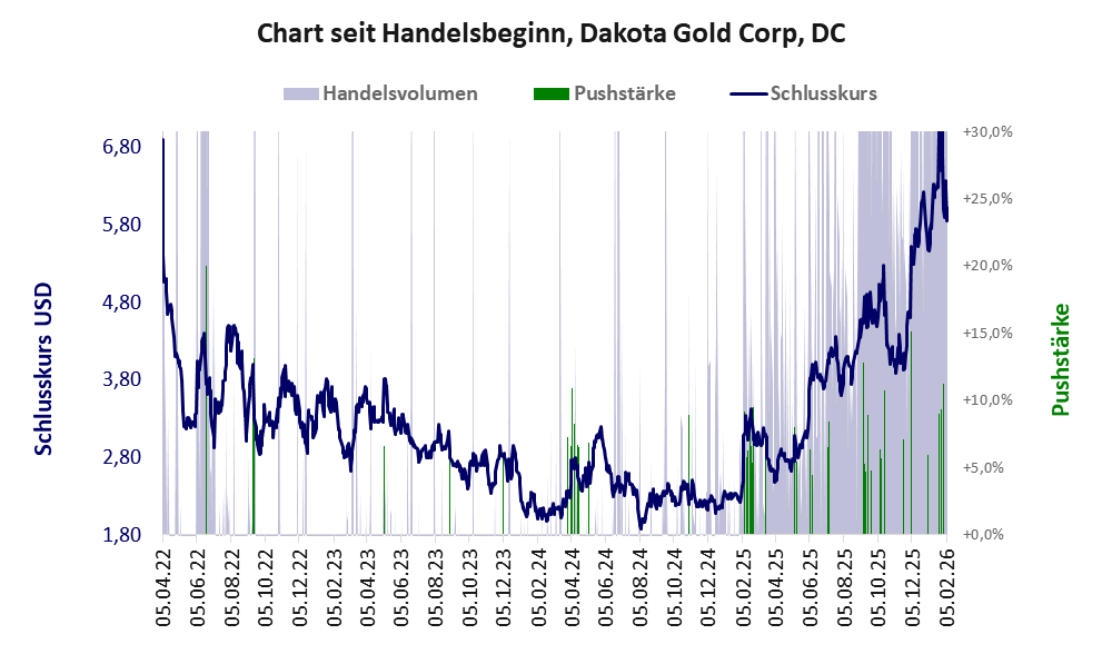 Dakota Gold besticht in erster Linie durch die hohe jährliche Geldverbrennung. Über diese Aktie berichtet Streetwise. Das tägliche Handelsvolumen betrug an obiger Börse während der letzten drei Monate bis Berichtsdatum: 1.303.809 Stück, das sind 1,2% der ausgegebenen Aktien.