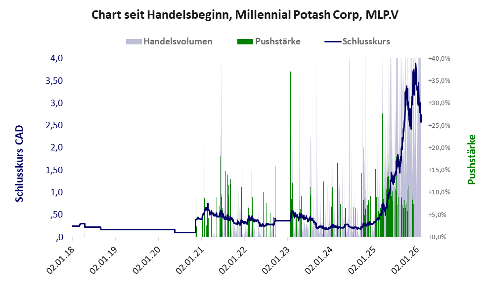 Über diese Aktie berichtet SRC. Das tägliche Handelsvolumen betrug an obiger Börse während der letzten drei Monate bis Berichtsdatum: 454.748 Stück, das sind 0,4% der ausgegebenen Aktien. Da Millennial Potash kaum Vermögen besitzt und unprofitabel ist, hat der Aktienkurs keinen Wert. Die Aktie dient in erster Linie Pushmanövern.