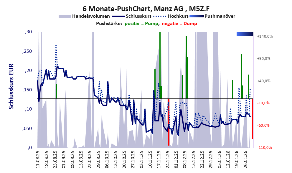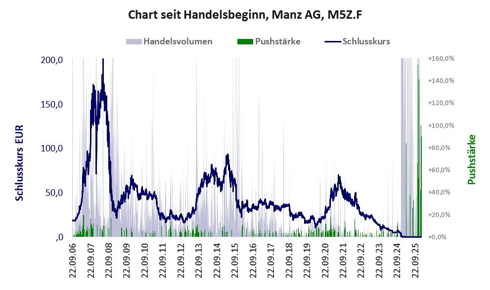 Ein solides Unternehmen, das mit Schwierigkeiten kämpft, die sich im Kursverfall bis 2026 widerspiegelten. Der Kurs wurde zum Teil stark gepusht, obwohl es sich bei Manz um keine Pusheraktie handelt.