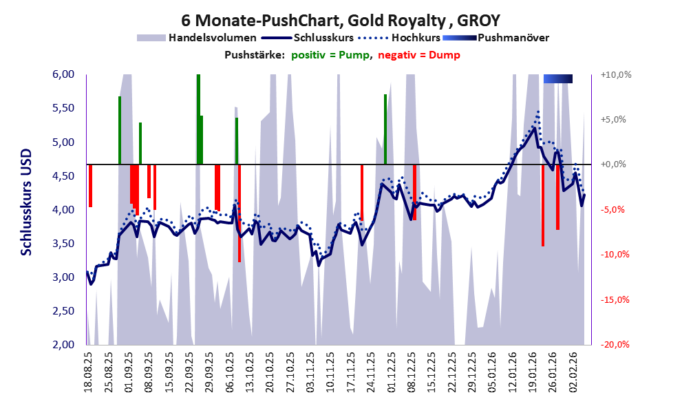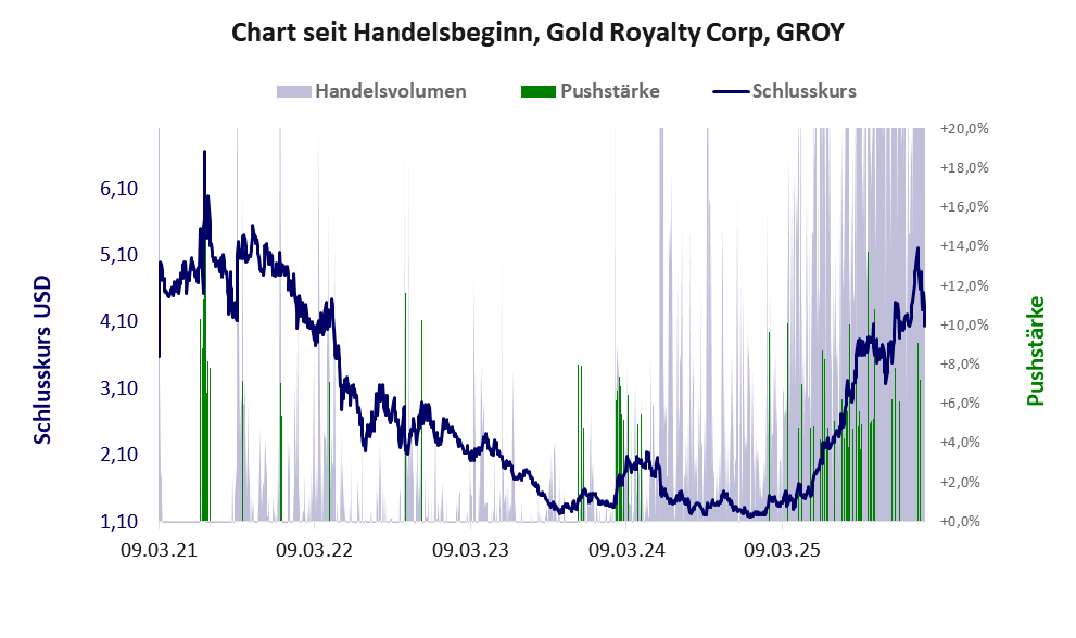 Gold Royalty besticht in erster Linie durch die hohe jährliche Geldverbrennung. Über diese Aktie berichtet JS Research. Das tägliche Handelsvolumen betrug an obiger Börse während der letzten drei Monate bis Berichtsdatum: 3.733.973 Stück, das sind 1,6% der ausgegebenen Aktien.