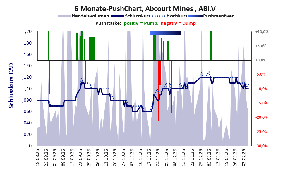 Über diese Aktie berichtet w:o. Das tägliche Handelsvolumen betrug an obiger Börse während der letzten drei Monate bis Berichtsdatum: 1.962.258 Stück, das sind 0,2% der ausgegebenen Aktien. Da Abcourt Mines kaum Vermögen besitzt und unprofitabel ist, hat der Aktienkurs keinen Wert. Die Aktie dient in erster Linie Pushmanövern.