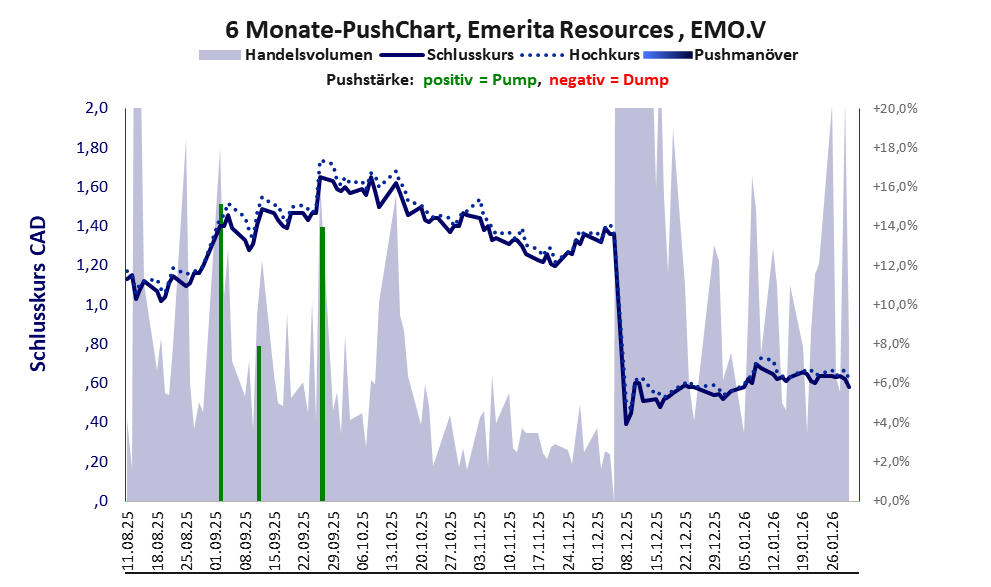 Im Gegensatz zur eigenen Einschätzung, über eine starke Bilanz zu verfügen, ist Emerita in Wahrheit ein wertloses Unternehmen, dessen Aktie verschiedene Pushmanöver hinter sich hat. Ein Gerichtsurteil ließ den Kurs Anfang Dez. 2025 um 50% kollabieren.