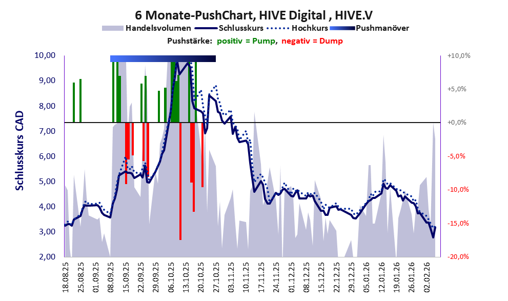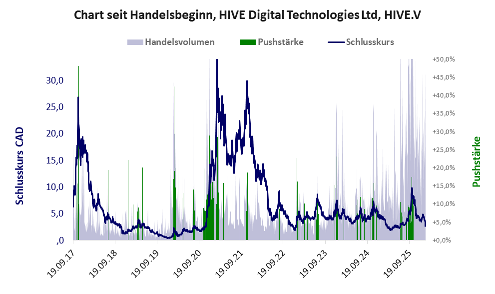HIVE Digital besticht in erster Linie durch die hohe jährliche Geldverbrennung. Über diese Aktie berichtet axino. Das tägliche Handelsvolumen betrug an obiger Börse während der letzten drei Monate bis Berichtsdatum: 1.839.833 Stück, das sind 0,7% der ausgegebenen Aktien.