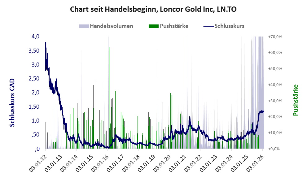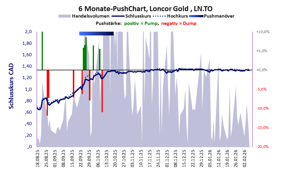 Bei dieser Aktie, über die axino berichtet, liegt das Refreshmodell vor und es gibt 1 Pump & Dump-Manöver. Das tägliche Handelsvolumen betrug an obiger Börse während der letzten drei Monate bis Berichtsdatum: 289.937 Stück, das sind 0,2% der ausgegebenen Aktien. Da Loncor Gold kaum Vermögen besitzt und unprofitabel ist, hat der Aktienkurs keinen Wert. Die Aktie dient in erster Linie Pushmanövern.