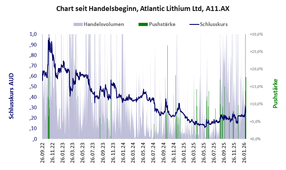 Atlantic Lithium besticht in erster Linie durch die hohe jährliche Geldverbrennung. Über diese Aktie berichtet axino. Das tägliche Handelsvolumen betrug an obiger Börse während der letzten drei Monate bis Berichtsdatum: 431.313 Stück, das sind 0,1% der ausgegebenen Aktien.