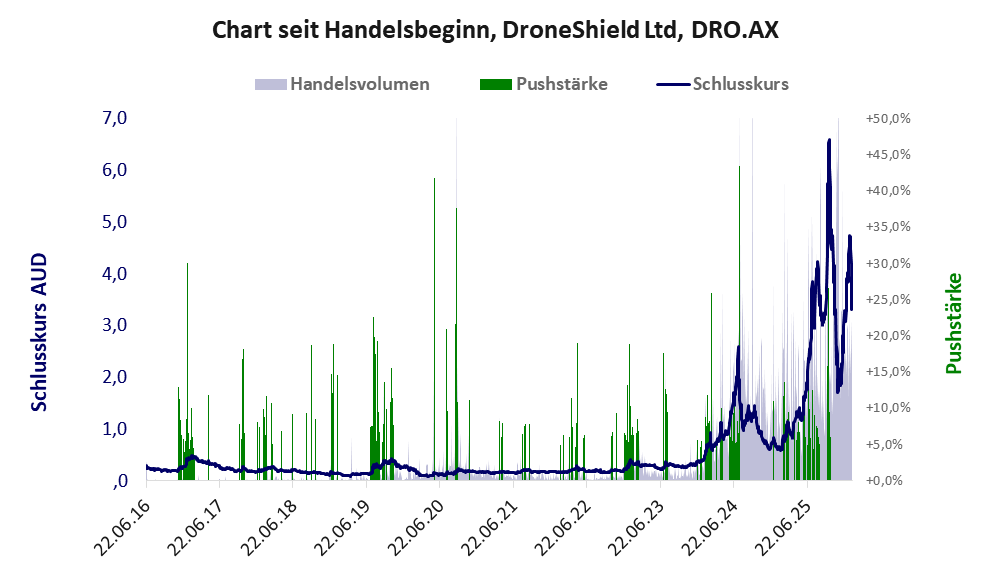 Die Finanzdaten von DroneShield sind gut und das PushScoring noch akzeptabel. Der hochvolatile Kurs weist klare, aber nicht sehr hohe Pushindikationen aus. Eine zuverlässige Interpretation der Aktie ist nicht möglich. Wahrscheinlich ist es keine der üblichen Pusheraktien.