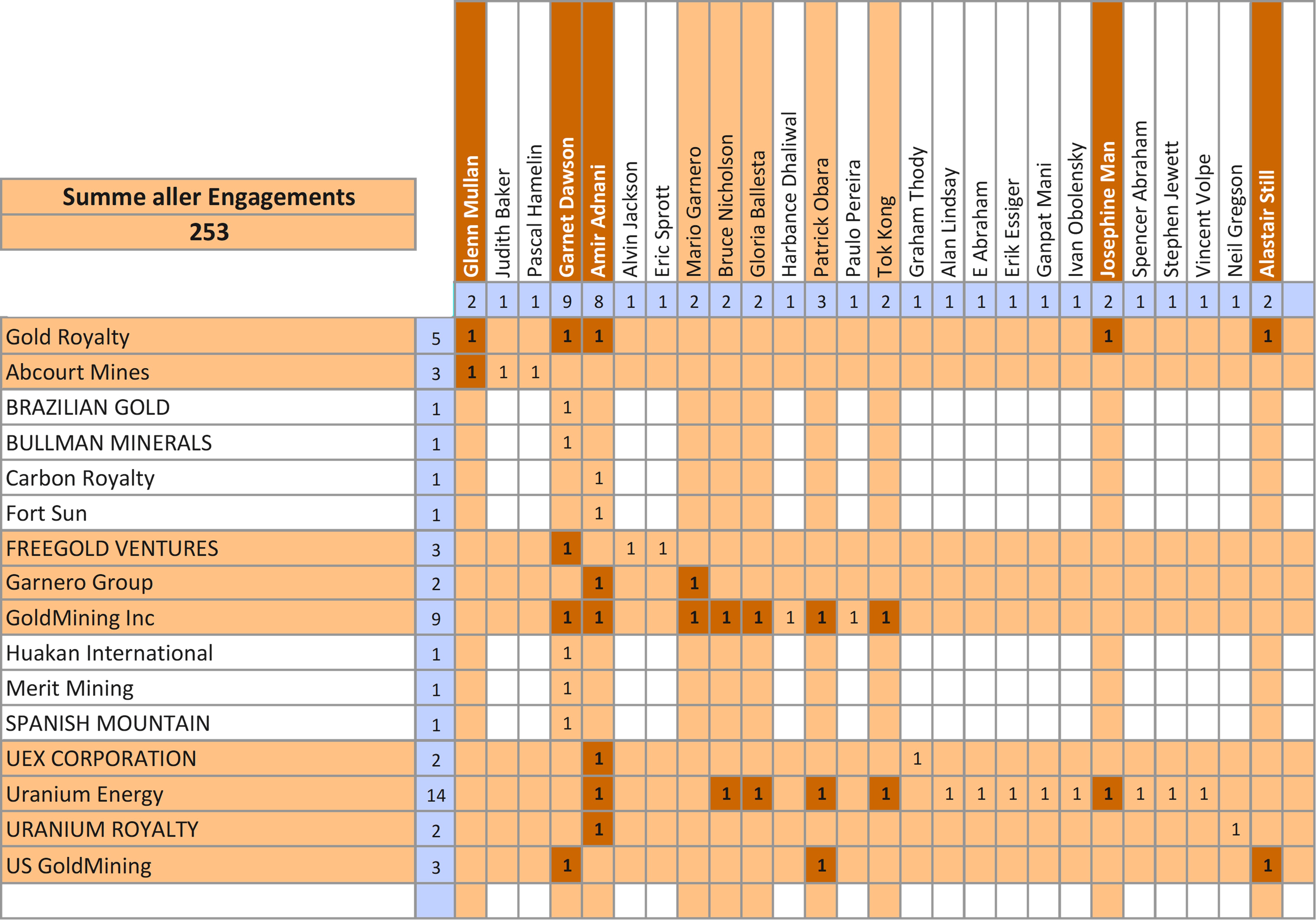 Paul Matysek (108), Christopher Cherry (68), Eric Sprott (61), Geoffrey Balderson (53), Anthony Jackson (49), Antony Sage (47), Carmelo Marrelli (46), Christopher Irwin (41), Konstantin Lichtenwald (40), Glen MacDonald (39), Frank Giustra (35), James Pakulis (35), Ian Middlemas (34), Dong Shim (33), Klaus Eckhof (31), Nick DeMare (31), Ross McElroy (31), Ryan Cheung (30), Gordon Keep (28), Kyle Appleby (28), Ravinder Kang (27), Sophie Karzis (27), Nathan Goodman (25), Kelly Pladson (24), Robert Scott (23), Christopher Cooper (23), Eugene Beukman (23), Nitin Kaushal (23), Scott Davis (23), Bryson Goodwin (22), Patrick Morris (22), Peter Born (22), David Stone (22), Darren Devine (21), Dusan Berka (21), Johannes Linde (20), Mark Brown (20), Praveen Varshney (20), David Lenigas (20), Sonny Janda (20), Jody Bellefleur (19), Robert Suttie (19), Joseph Meagher (19), Cyrus Driver (19), Jeffrey Dare (18), Sean Charland (18), Zahara Kanji-Aquino (18), Gregory Thomson (17), Hansjörg Plaggemars (17), Eldon Smith (17), Alnesh Mohan (17), Alicia Milne (17), Ya’acob Abdullah (17), John Anderson (17), Anthony Zelen (16), Scott Reeves (16), Donald Gordon (16), Francisco Montori (16), Christopher Hopkins (16), David Cross (16), Brayden Sutton (15), Brian Morrison (15)