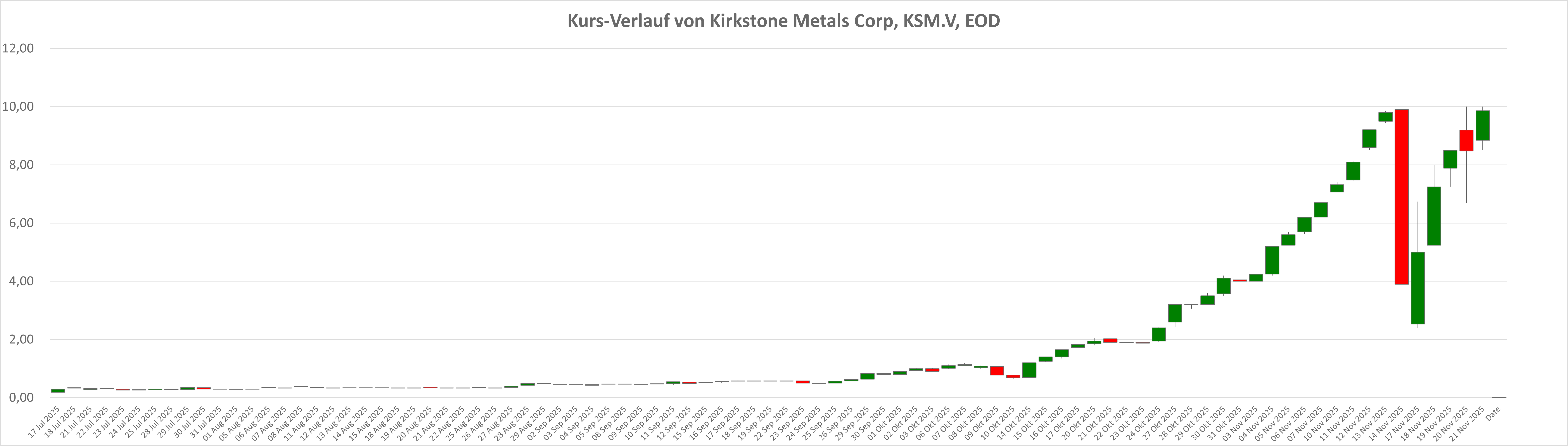 Das Szenario des Pushmanövers legte großen Wert auf langsamen und unauffälligen, aber nachhaltigen Kursanstieg. Da die Handelsdaten von der kanadischen Venture Börse den Kursverlauf nicht plausibel machen, muss und darf man von umfangreichen OTC-Handel ausgehen, der den Kurs in fünf Wochen von rund 1 Dollar auf 10 Dollar hochtrieb. Und es kam, wie es kommen musste: am 13. Nov. 2025 war Inkasso-Tag, der offenkundig im OTC-Handel über den Tisch ging. Er brachte den Akteuren der Kirkstone Metals bei einem angenommenen Verkauf von 10 Millionen Aktienstück 60 Millionen Gewinn plus dem Teil, zu dem sie ihre Aktien zu Billigstpreisen bezogen hatten.