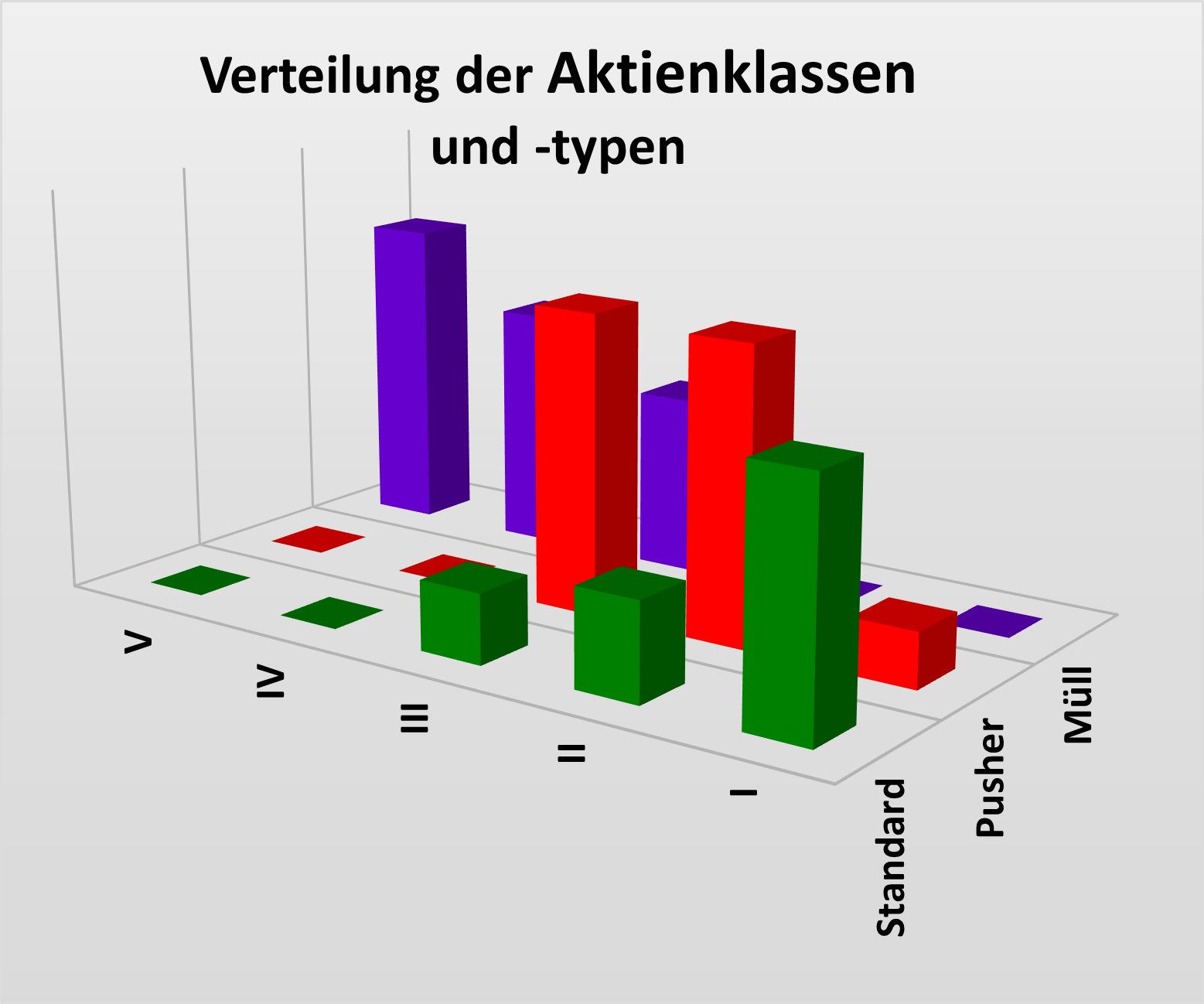 Die statistische Auswertung der Aktiendaten führt zur Klassifizierung derselben in Aktientypen und Aktienklassen. Aktientypen sind Standard-, Pusher- und Müllaktien. Aktienklassen sind: I (sehr gut), II, III, IV und V (sehr schlecht), deren Zustandekommen aus den beiden Mappings der Aktien resultiert.