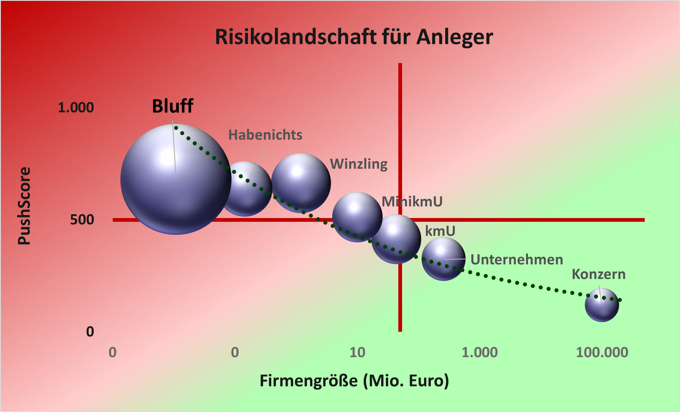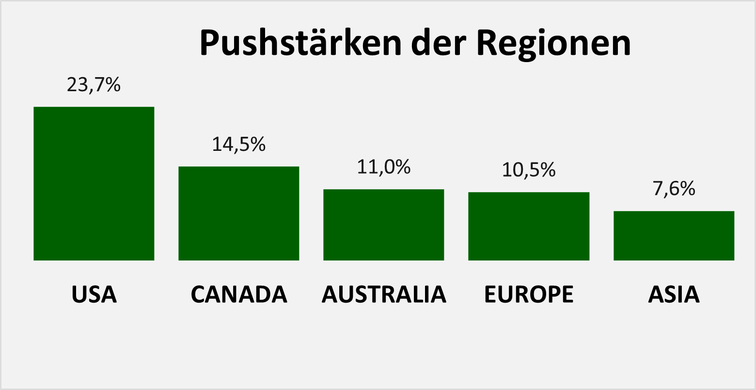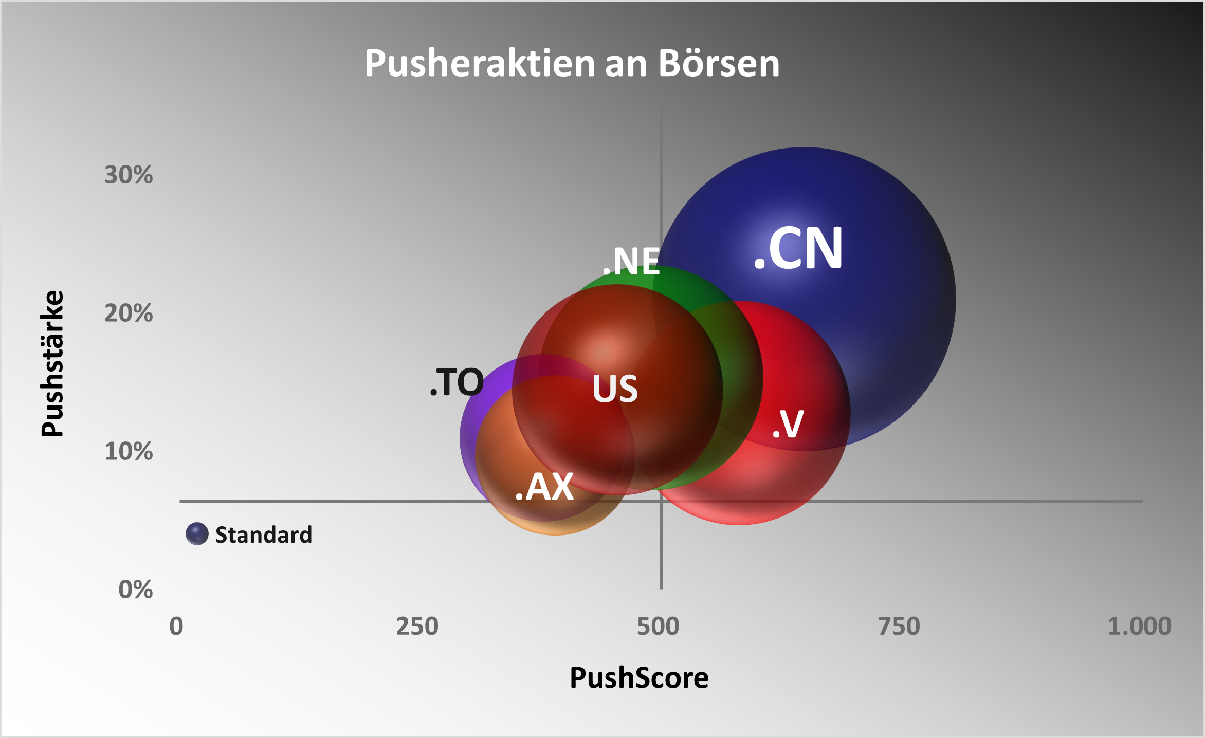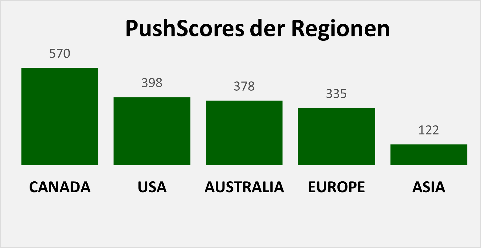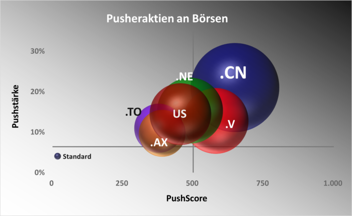 Sowohl Firmengröße als auch Heimatbörse einer Aktie stehen in direkter Beziehung zum Anlegerrisiko. Je kleiner die Firma, desto höher der PushScore und das Verlustrisiko für Anleger. Amerikanische und australische Aktien haben ein zum Teil deutlich erhöhtes Risiko.