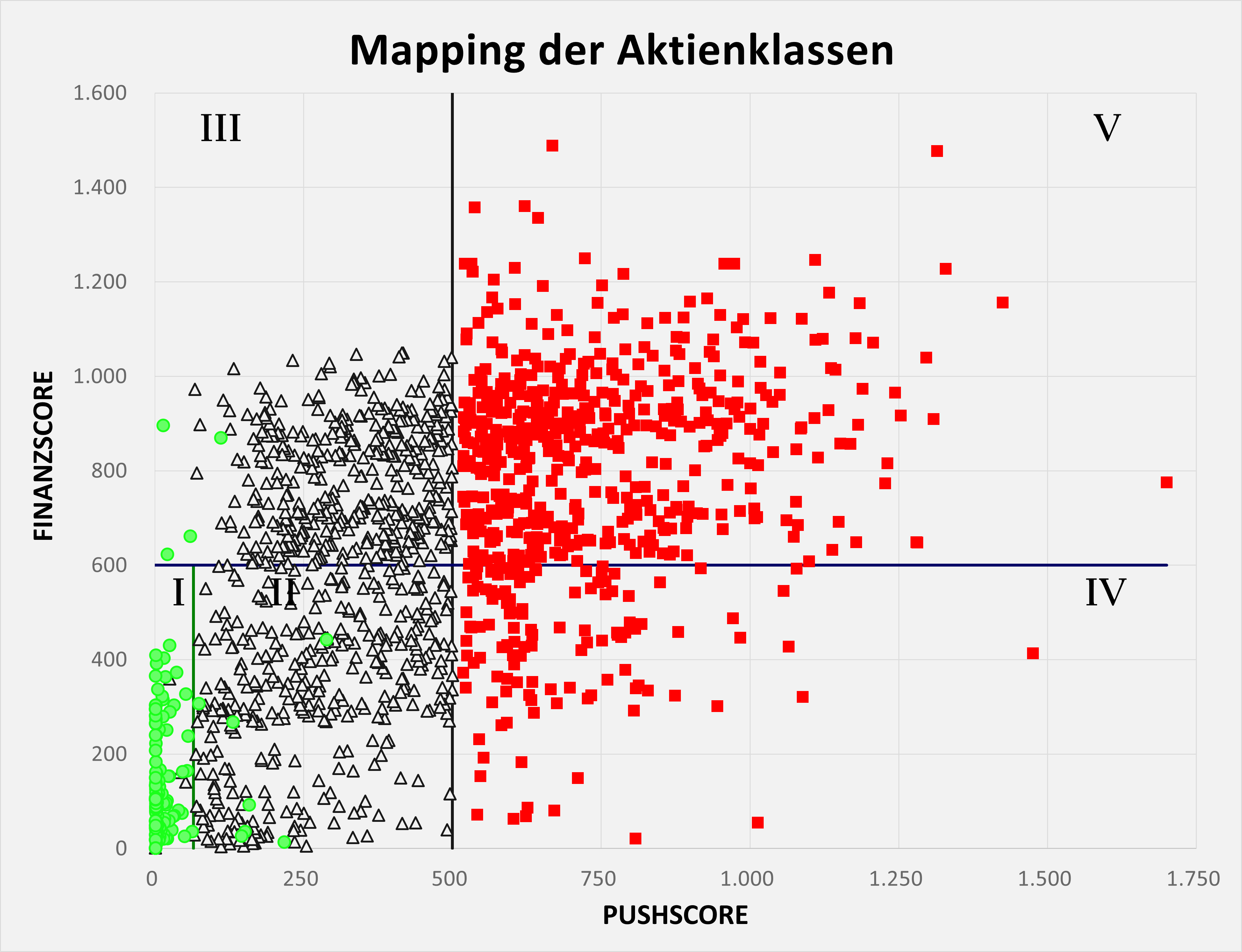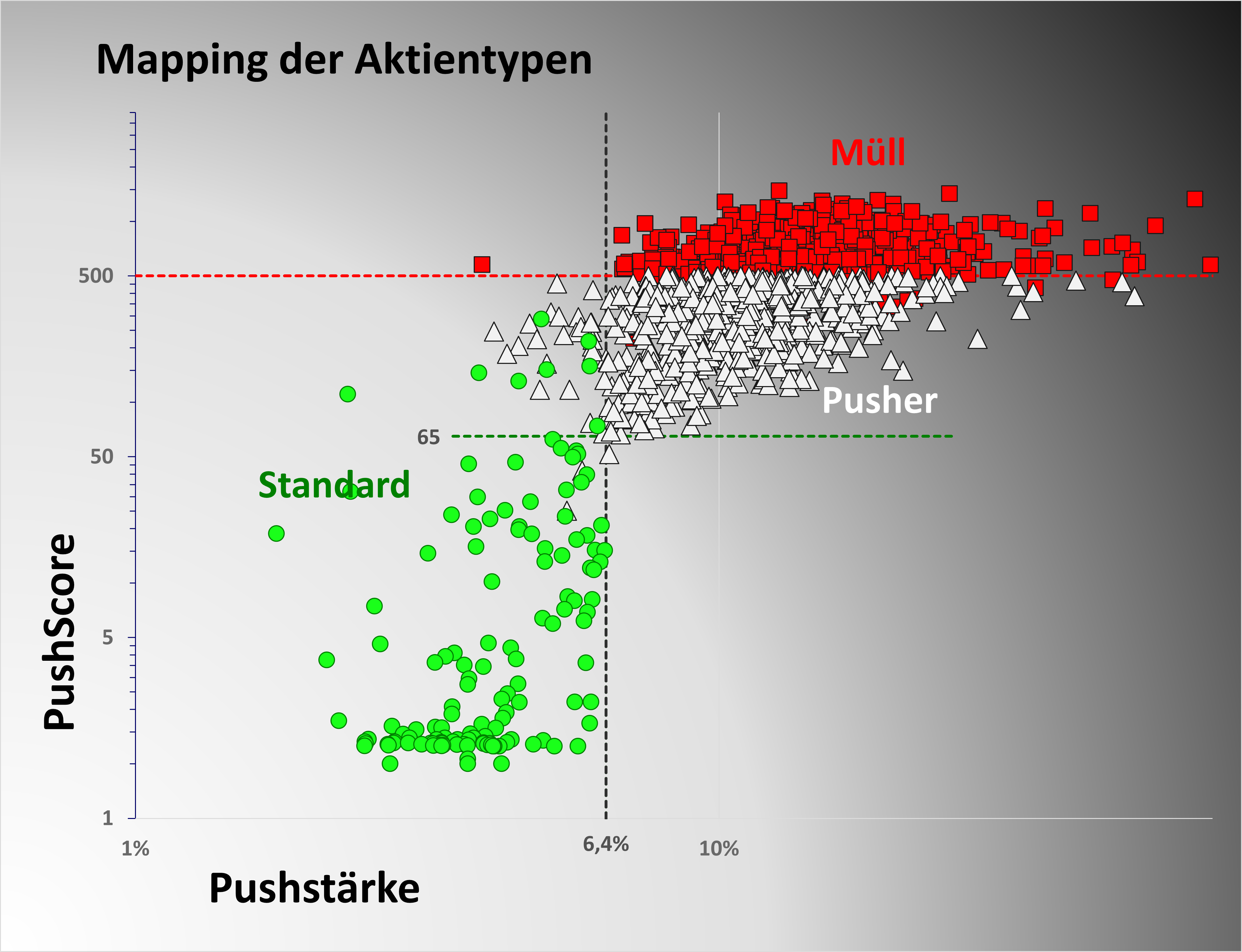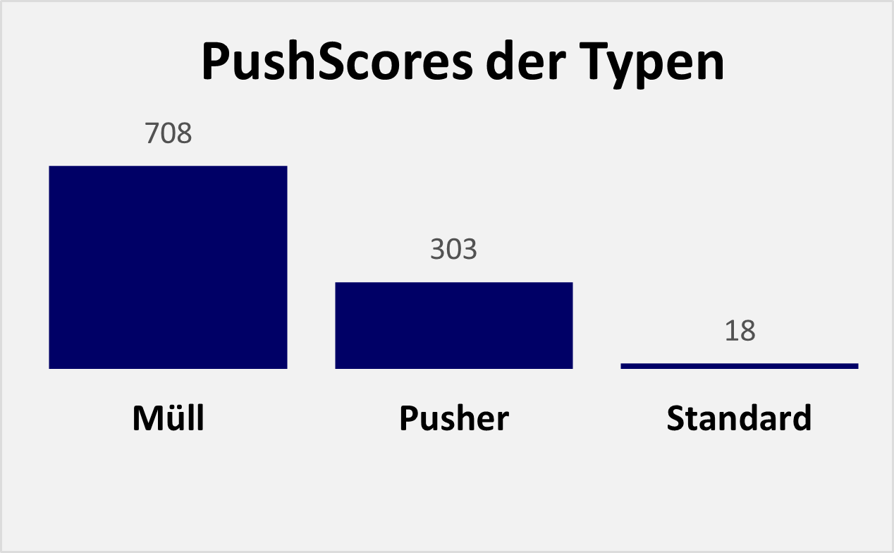 Pusheraktien berechnen heißt, es müssen PushScore und FinanzScore ermittelt werden. PushScore und FinanzScore ermöglichen die Einteilung von Aktien in die Aktientypen Standard-, Pusher- und Müllaktien sowie in die Aktienklassen I (sehr gut), II, III, IV und V (sehr schlecht). Bereits mittels PushScore und Pushstärke kann eine Pusheraktie eindeutig identifiziert werden; der FinanzScore liefert „nur noch“ ein zusätzliches Qualitätsmerkmal.