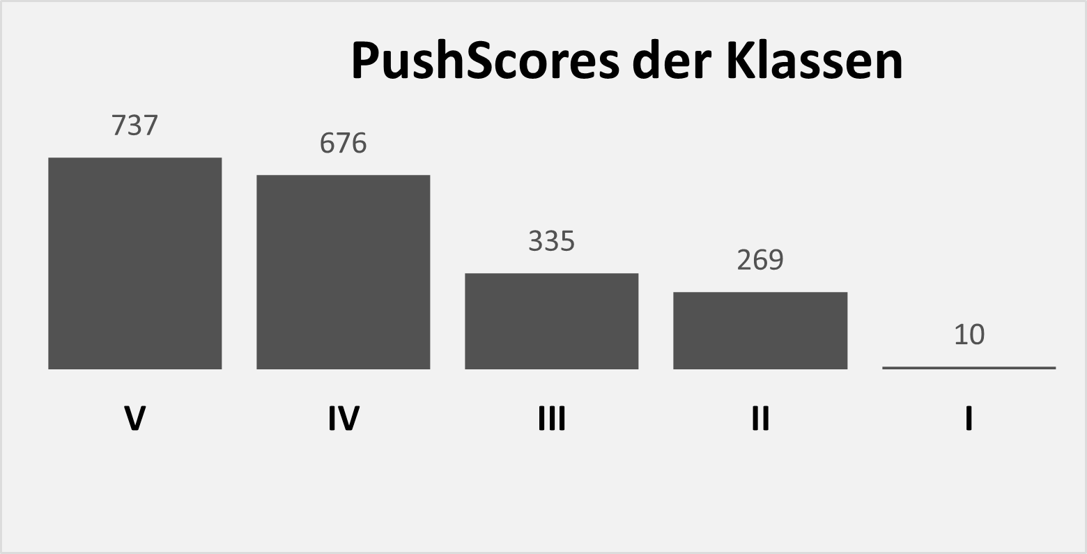 Sowohl PushScore als auch FinanzScore werden nach demselben Schema berechnet, bei dem Maluspunkte je Einflussgröße ermittelt werden. Die Abhängigkeit zwischen Einflussgröße und Punktezahl ist vornehmlich exponentieller oder logarithmischer Natur, wie im Beispiel für die Pushstärke dargestellt.