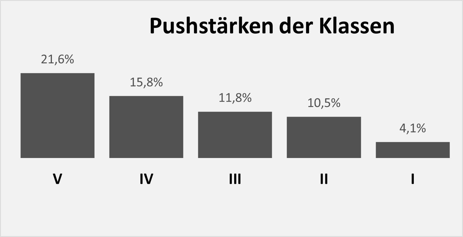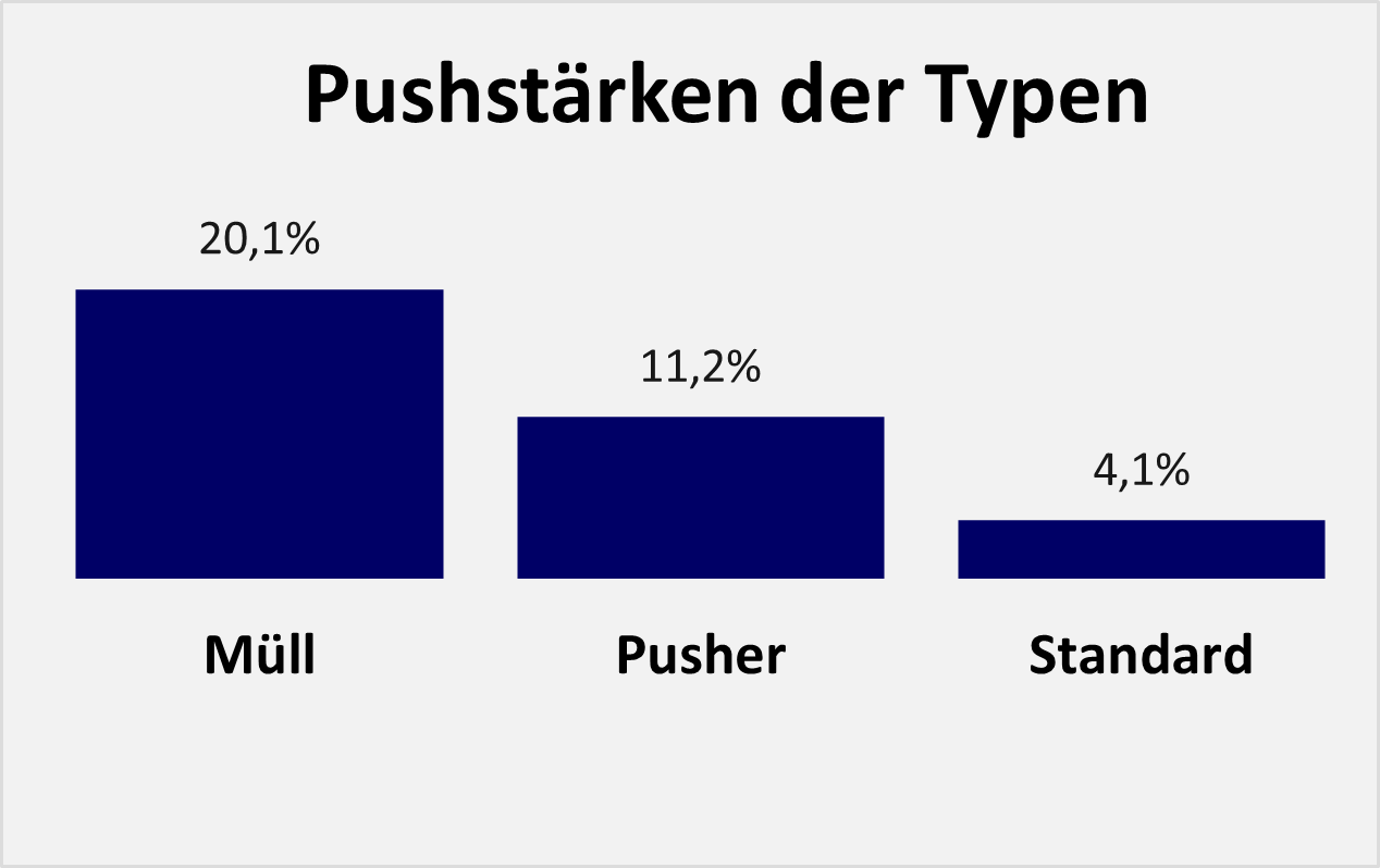 Die verschiedenen Statistiken über die Verteilung der Pushstärken und PushScores nach Klassen, Typen und Regionen sind selbsterklärend und zeigen, wie die Risiken von Pusheraktien verteilt sind.