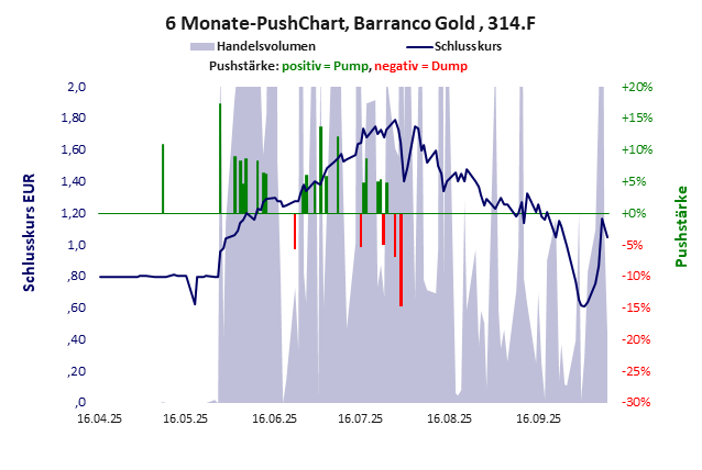 PushCharts nehmen die letzten sechs Monate Kursentwicklung unter die Lupe und analysieren die Pushstärken, die zeigen, ob geksuft (Pump) oder verkauft (Dump) wird. Damit zeigen die PushCharts sehr schön, ob ein Kurs und wie ein Kurs manipuliert wird. Man kann sie lesen wie ein Bilderbuch. Blättere einfach durch die Charts und erkenne den Umfang an Manipulation.