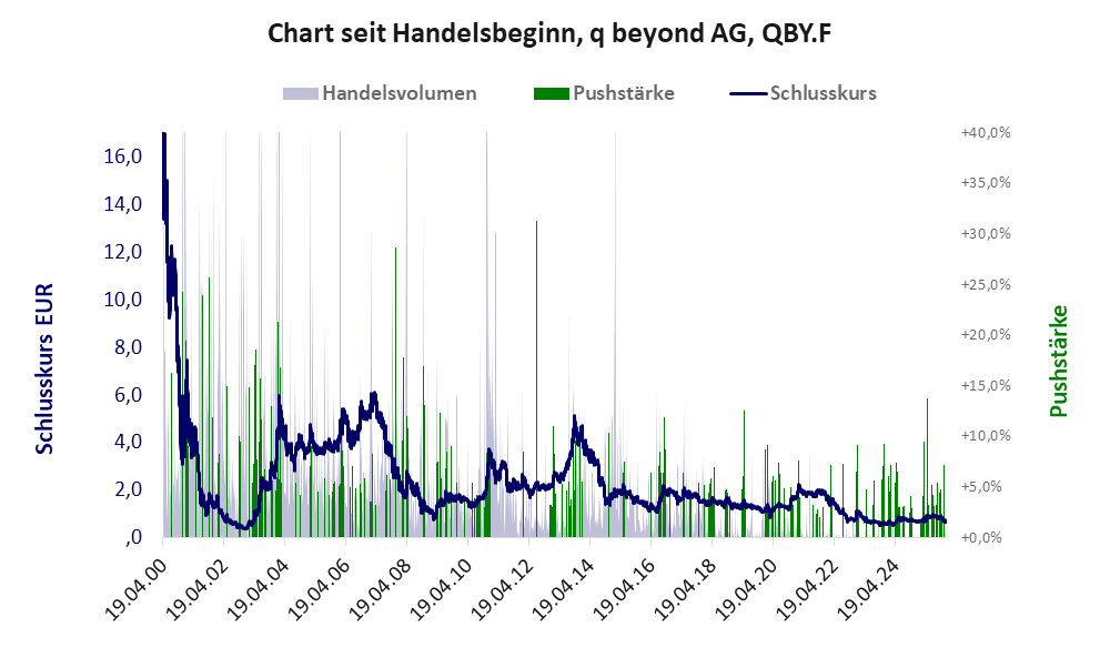 Ende Mai 2025 heißt esObwohl der Kurs durch das starke Pushing ab Februar 2025 um 40% nach oben getrieben wurde und etliche Analysten die Aktie weiter mit Buy einstufen, geben die Daten hier keinen Anlass zu besonderem Optimismus. Die Aktie hat keine Stabilität für einen echten Aufschwung. Bei dieser Aktie liegt das „Inkassomodell“ vor, bei dem der Aktienkurs zu Beginn der Geschichte sein Allzeithoch hat. Die Akteure verkaufen schon zu Beginn nach und nach ihre billigst erworbenen Aktien, so dass der Kurs in verhältnismäßig kurzer Zeit abstürzt. Danach dümpelt der Aktienkurs in den meistn Fällen nahe null dahin und die Aktie dient nur noch kleineren, dennoch gewinnbringenden Pushmanövern und in vielen Fällen dem Algotrading. Dem ersten Einbruch nachfolgende größere Pushmanöver sind aber nicht ausgeschlossen.