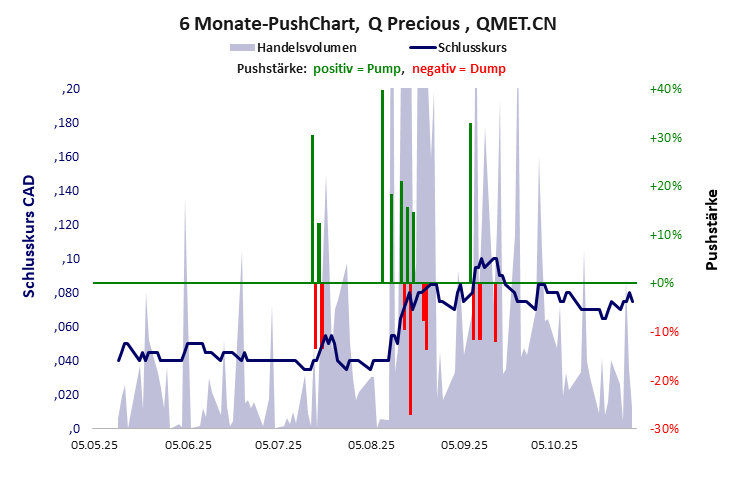 Q Precious hat ein sehr schlechtes Gesamtscoring und ist ein mickriger Pennystock mit praktisch einem Totalverlust. Das Gesamtvermögen ist karg, die Vermögenswerte scheinen nicht werthaltig zu sein, der Umsatz ist nicht existent, die Ertragslage extrem verlustreich, die Geldverbrennung extrem hoch.