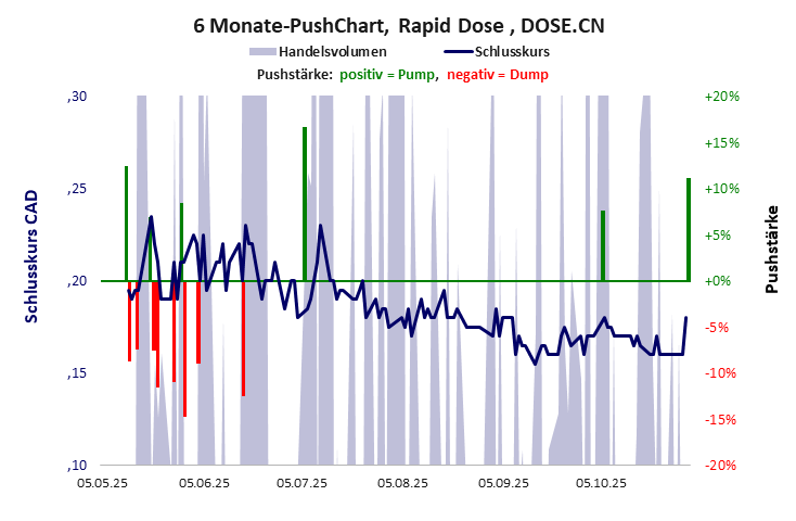 Eine Firma mit nichts als einem gepushten Kurs. Rapid Dose hat ein schlechtes Gesamtscoring und ist ein mickriger Pennystock mit einem riesigen Kursverlust. Das Gesamtvermögen ist karg, die Vermögenswerte scheinen werthaltig zu sein, der Umsatz ist überschaubar, die Ertragslage extrem verlustreich, die Geldverbrennung extrem hoch.