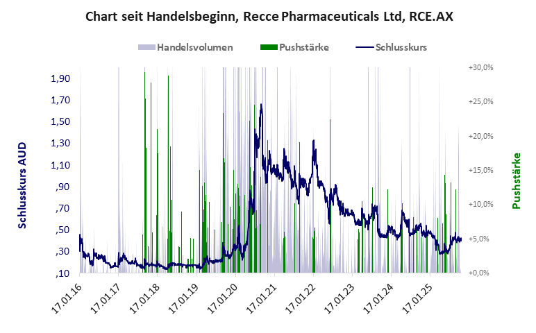 ein typischer Pharmapush eines völlig wertlosen Unternehmens. Recce Pharmaceuticals hat ein kritisches Gesamtscoring und ist ein kleiner Pennystock mit Kursgewinn. Das Gesamtvermögen ist überschaubar, die Vermögenswerte scheinen nicht werthaltig zu sein, der Umsatz ist nicht existent, die Ertragslage extrem verlustreich, die Geldverbrennung extrem hoch.