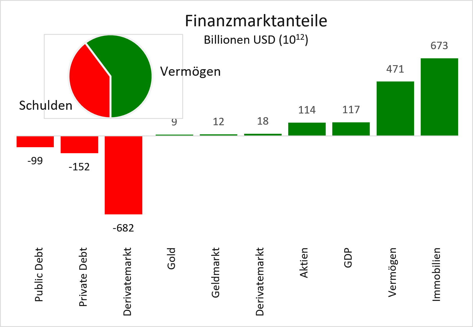 Die globale Verschuldung beträgt 933 Billionen (=933*1012) USD. Das Vermögen beträgt 1.414 Billionen USD.