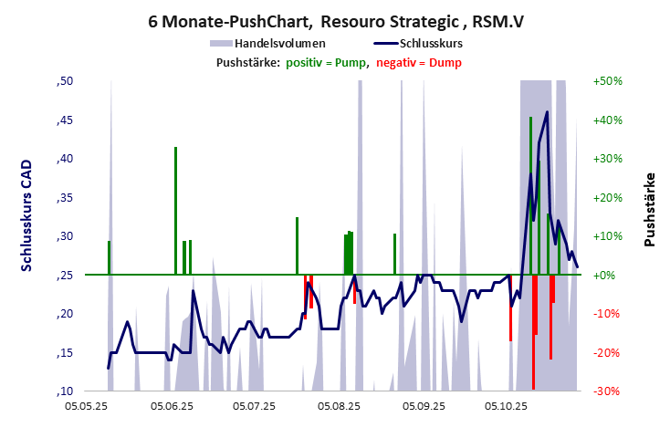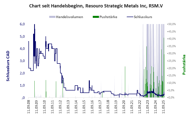 Schön zu sehen, dass erst ab Sommer 2023 gepusht wird, aber ohne Erfolg. Die Anleger haben die Wertlosigkeit von Resouro erkannt. Resouro Strategic hat ein kritisches Gesamtscoring und ist ein kleiner Pennystock mit einem riesigen Kursverlust. Das Gesamtvermögen ist überschaubar, die Vermögenswerte scheinen sehr werthaltig zu sein, der Umsatz ist nicht existent, die Ertragslage extrem verlustreich, die Geldverbrennung hoch.