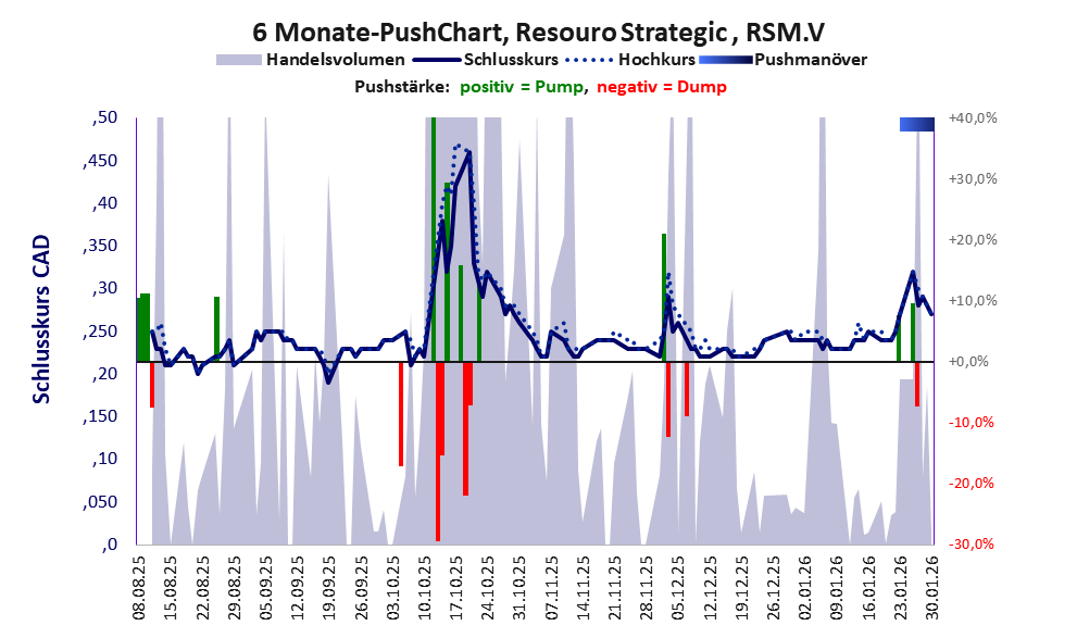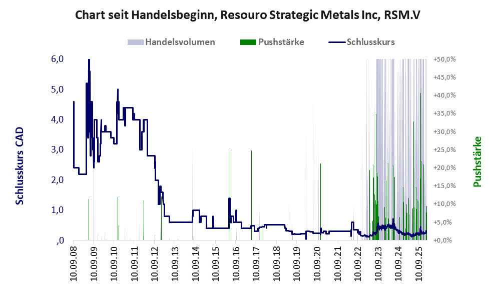 Man kann sehr gut erkennen, dass erst ab Sommer 2023 gepusht wird, aber ohne großen Erfolg. Die Anleger haben die Wertlosigkeit von Resouro offenbar erkannt.