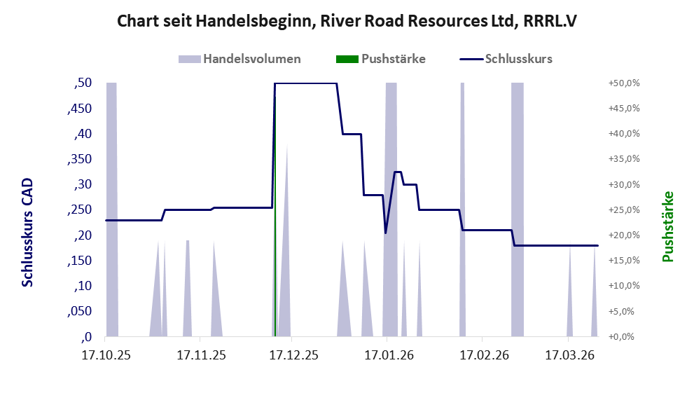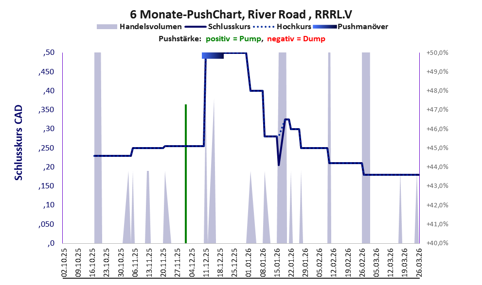 Das tägliche Handelsvolumen betrug an obiger Börse während der letzten drei Monate bis Berichtsdatum: 1.142 Stück, das sind 0,0% der ausgegebenen Aktien. Da River Road kaum Vermögen besitzt und unprofitabel ist, hat der Aktienkurs keinen Wert. Die Aktie dient in erster Linie Pushmanövern.