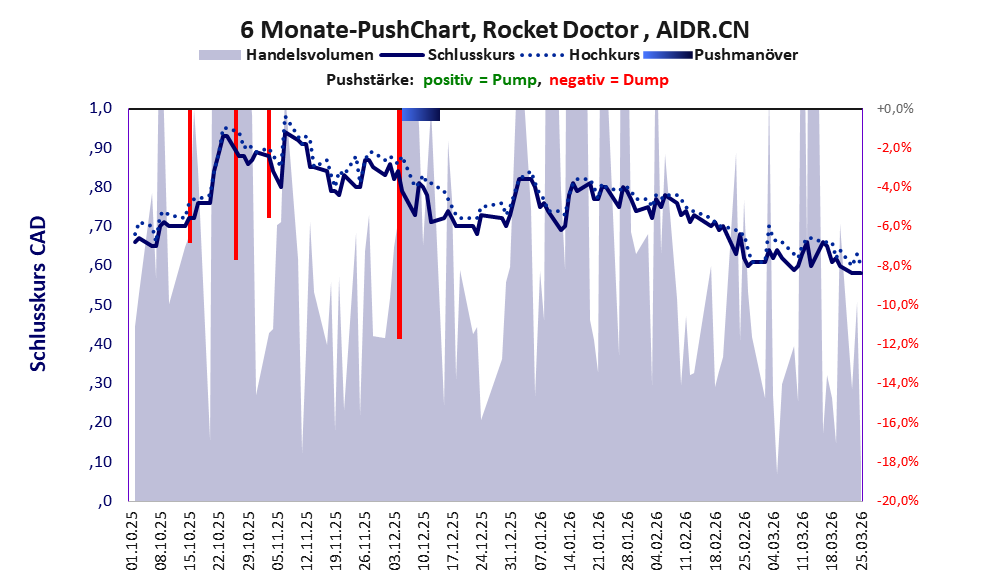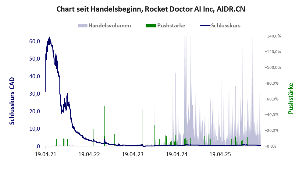 Bei dieser Aktie, über die Streetwise berichtet, liegt das Inkassomodell vor und es gibt 2 Pump & Dump-Manöver. Das tägliche Handelsvolumen betrug an obiger Börse während der letzten drei Monate bis Berichtsdatum: 220.869 Stück, das sind 0,2% der ausgegebenen Aktien. In Aktien der Klasse V darf man grundsätzlich nicht investieren. Es gibt keinen ordentlichen Geschäftsbetrieb. Die Aktie hat nur den Zweck, mit Pushmanövern oder Algotrading an der Börse Kasse zu machen.