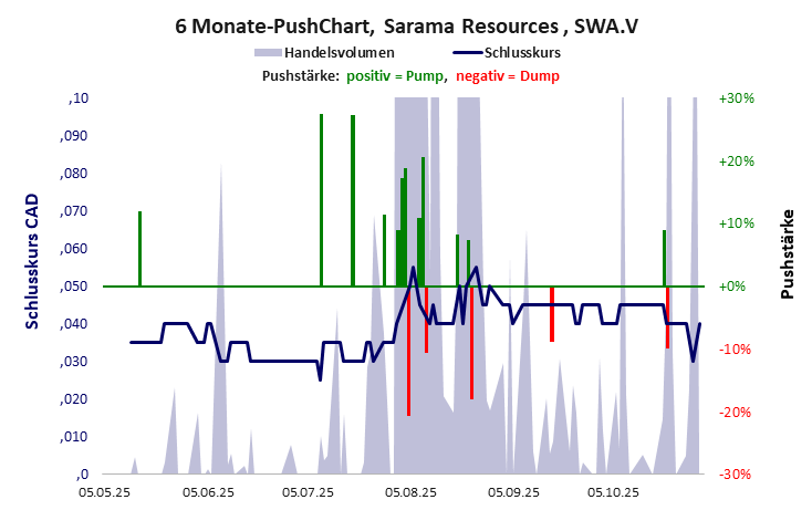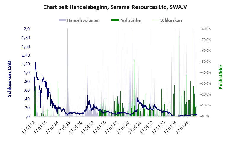 Sarama Resources hat ein unbefriedigendes Gesamtscoring und ist ein mickriger Pennystock mit einem riesigen Kursverlust. Das Gesamtvermögen ist karg, die Vermögenswerte scheinen nicht werthaltig zu sein, der Umsatz ist nicht existent, die Ertragslage extrem verlustreich, die Geldverbrennung extrem hoch.