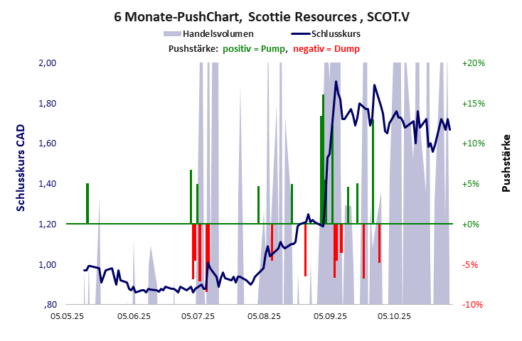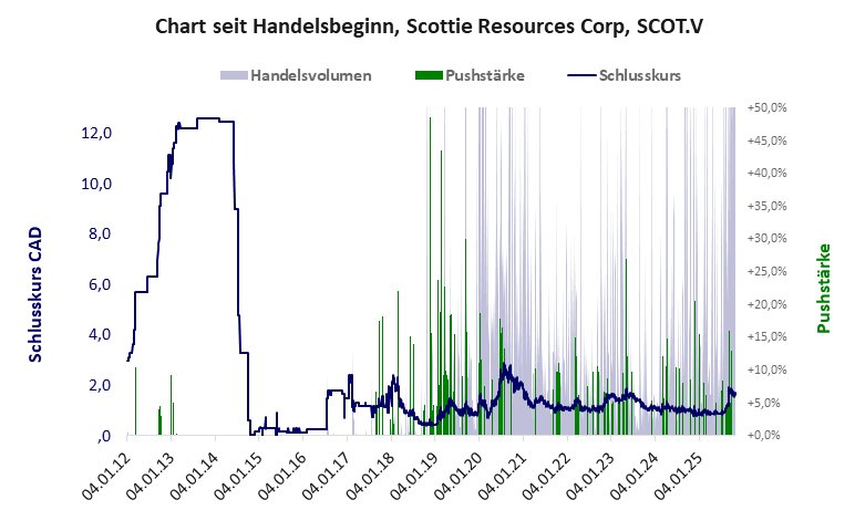 Geldverbrennungsmaschine, sonst nichts. Scottie Resources hat ein schwaches Gesamtscoring und ist eine billige Aktie mit einem starken Kursverlust. Das Gesamtvermögen ist überschaubar, die Vermögenswerte scheinen nicht werthaltig zu sein, der Umsatz ist nicht existent, die Ertragslage extrem verlustreich, die Geldverbrennung extrem hoch.