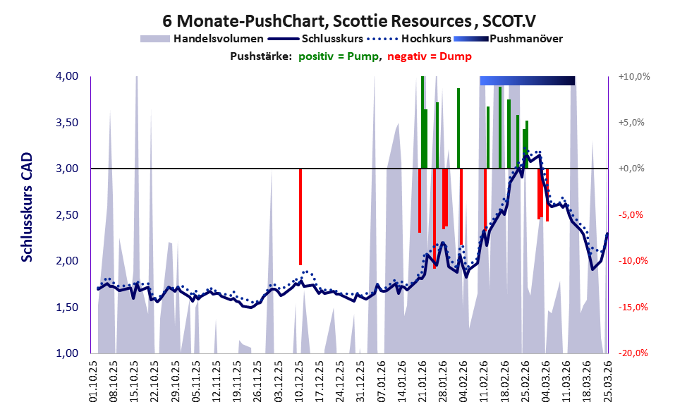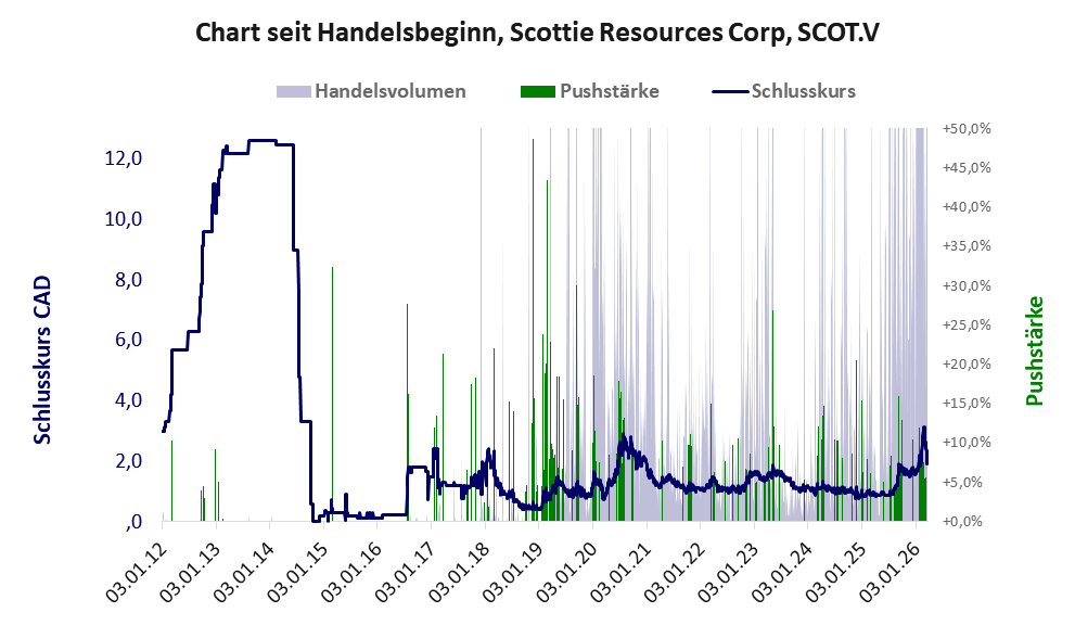 Über diese Aktie berichtet w:o. Das tägliche Handelsvolumen betrug an obiger Börse während der letzten drei Monate bis Berichtsdatum: 179.940 Stück, das sind 0,2% der ausgegebenen Aktien. Da Scottie Resources kaum Vermögen besitzt und unprofitabel ist, hat der Aktienkurs keinen Wert. Die Aktie dient in erster Linie Pushmanövern.