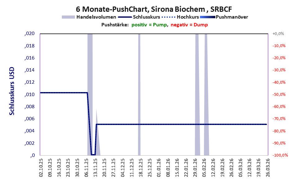 Bei dieser Aktie, über die w:o berichtet, gibt es 1 Pump & Dump-Manöver. Das tägliche Handelsvolumen betrug an obiger Börse während der letzten drei Monate bis Berichtsdatum: 583 Stück, das sind 0,0% der ausgegebenen Aktien. In Aktien der Klasse V darf man grundsätzlich nicht investieren. Es gibt keinen ordentlichen Geschäftsbetrieb. Die Aktie hat nur den Zweck, mit Pushmanövern oder Algotrading an der Börse Kasse zu machen.