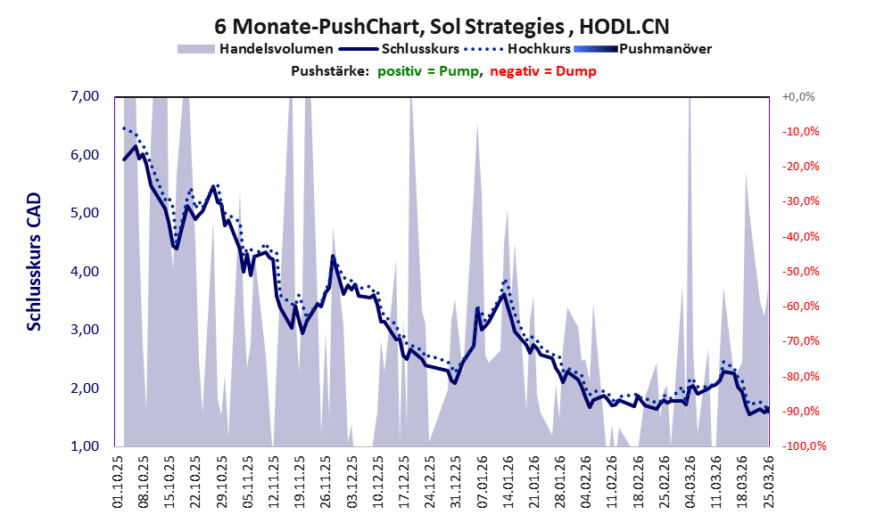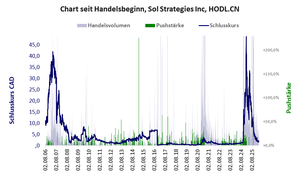 Bei dieser Aktie, über die Streetwise berichtet, gibt es 3 Pump & Dump-Manöver. Das tägliche Handelsvolumen betrug an obiger Börse während der letzten drei Monate bis Berichtsdatum: 63.636 Stück, das sind 0,2% der ausgegebenen Aktien. In Aktien der Klasse V darf man grundsätzlich nicht investieren. Es gibt keinen ordentlichen Geschäftsbetrieb. Die Aktie hat nur den Zweck, mit Pushmanövern oder Algotrading an der Börse Kasse zu machen.