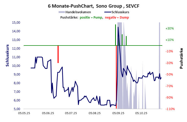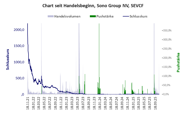 ein problematischer Habenichts mit massiv gepushtem Kurs ohne jeden Erfolg. Kursanstieg im Jan. 25 wegen einer 1:75 Aktienzusammenlegung. Sono Group hat ein inakzeptables Gesamtscoring und ist ein mickriger Pennystock mit praktisch einem Totalverlust. Das Gesamtvermögen ist karg, die Vermögenswerte scheinen noch werthaltig zu sein, der Umsatz ist mickrig, die Ertragslage extrem verlustreich, die Geldverbrennung extrem hoch.