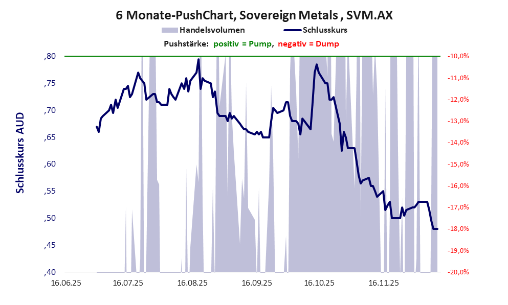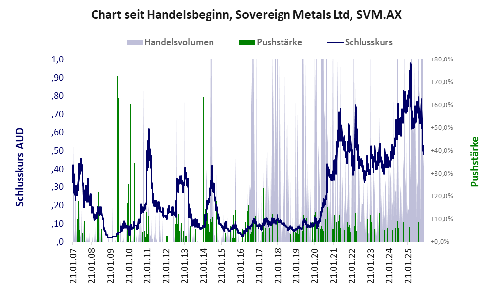 Netzwerk: Der Einstieg 2023 von Rio Tinto mit knapp 20% per Juli 2024 hatte dem Kurs deutlichen Schub gegeben. Erklärlich ist der Einstieg von Rio Tinto nur, wenn der Pilotabbau tatsächlich vielversprechende Ergebnisse geliefert hatte und gute Erfolgschancen bestanden. Seitdem hat sich nichts getan, außer dass der Kurs just in zeitlicher Nähe mit einem Private Placement ab Ende März 2025 um fast 40% fiel. Das schlechte Scoring von Sovereign Metals ist keine Basis für Zuversicht. Alles hängt am seidenen Faden des Explorationserfolgs, der im Tagebau erheblich besser ist als die statistische Quote von 1 3000. Dass nach über zwei Jahren noch immer keine Erfolgssignale kommen, stimmt bedenklich. Und je länger die Zeit ohne Explorationserfolg verstreicht, desto kritischer wird der Zustand der Aktie werden.