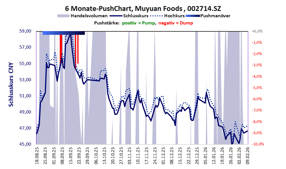Das tägliche Handelsvolumen betrug an obiger Börse während der letzten drei Monate bis Berichtsdatum: 36.685.018 Stück, das sind 0,7% der ausgegebenen Aktien. Bei Muyuan Foods liegt ein ordentlicher Geschäftsbetrieb vor.