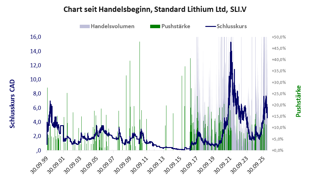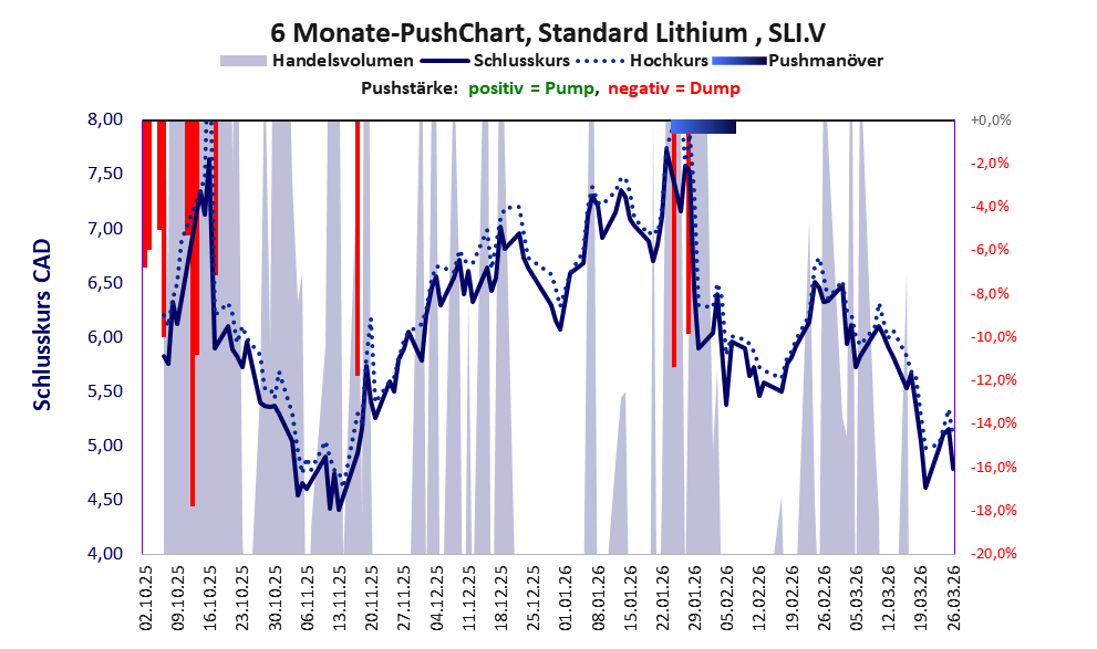 Bei dieser Aktie, über die Apaton berichtet, gibt es 1 Pump & Dump-Manöver. Das tägliche Handelsvolumen betrug an obiger Börse während der letzten drei Monate bis Berichtsdatum: 288.032 Stück, das sind 0,1% der ausgegebenen Aktien. Bei Standard Lithium fehlt ein operatives Geschäft, stattdessen wird das Geld der Investoren verbrannt.