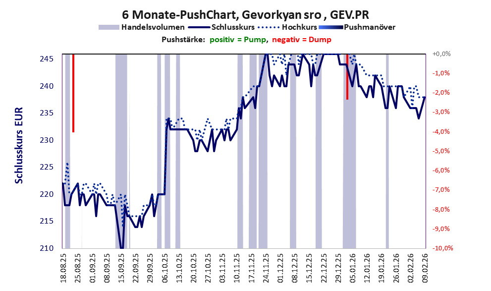 Das tägliche Handelsvolumen betrug an obiger Börse während der letzten drei Monate bis Berichtsdatum: 3.651 Stück, das sind 0,0% der ausgegebenen Aktien. Bei Gevorkyan sro liegt ein ordentlicher Geschäftsbetrieb vor.